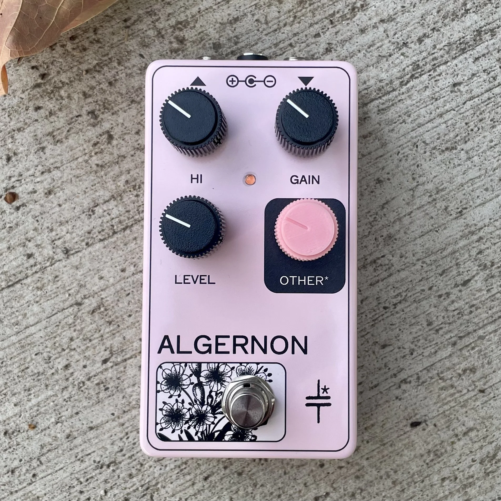 Algernon is an ode the Japanese RAT. This classic distortion has a three controls; Level, Gain, and Tone. The tone control is the modern standard or CW to let hi thru, CCW to cut hi. The Other* control is a four position mode selector.