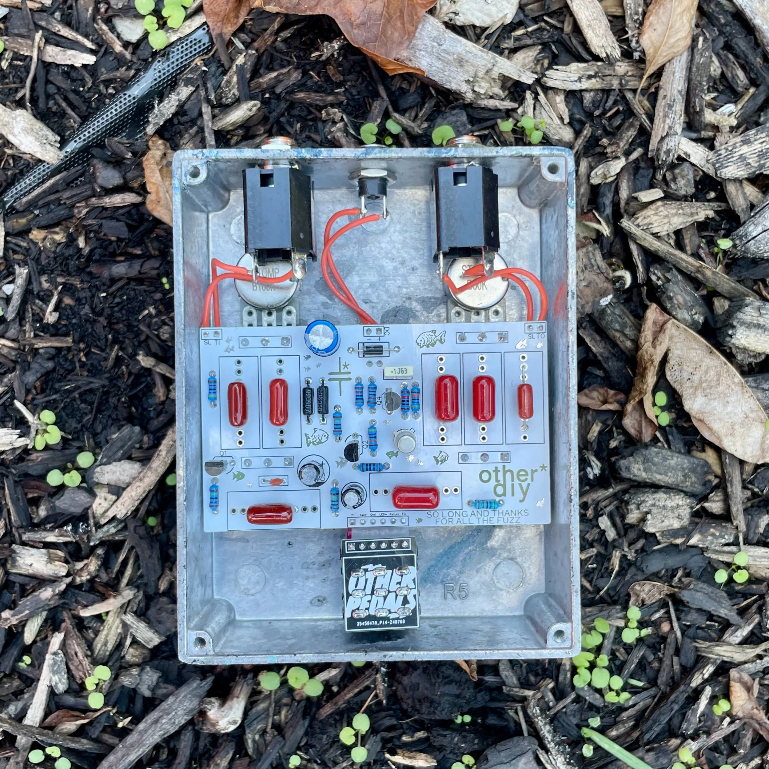Electra Distortion into a Push Me Pull You Octave. This isn’t as fuzzy as the Lizard Queen with the Bazz Fuss in front and the octave isn’t as pronounced. However, this creates an awesome dissonance on chords with low gain.